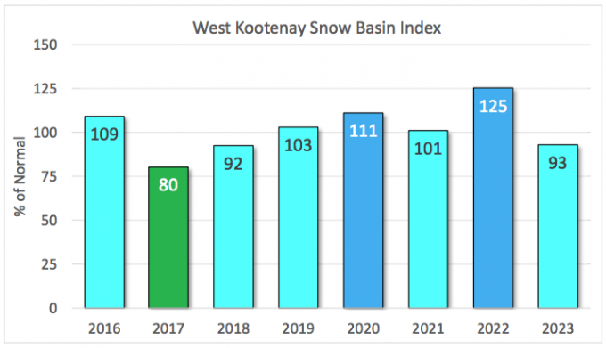 Over the last eight years the current dip for the West Kootenay is not the most pronounced, with 2017 showing 80 per cent of normal at this same time, and 2018 registering 92 per cent.