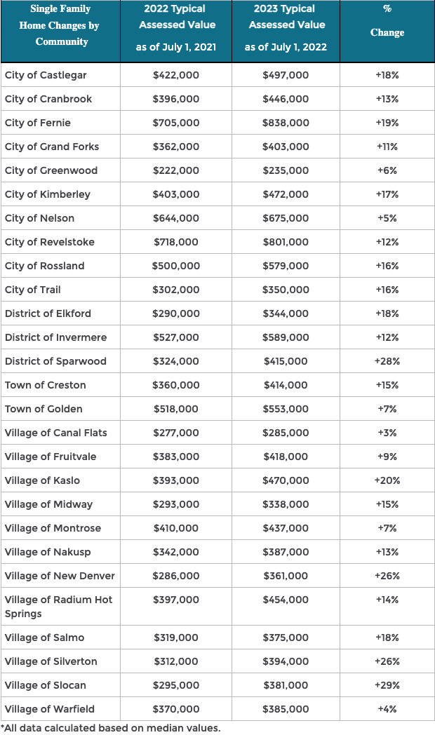 "Most homeowners throughout the Kootenay Columbia region can expect an increase in assessed value between 5% and 20% with a handful of communities higher than that range,” says Kootenay Columbia Deputy Assessor Sharlynn Hill in the media release.