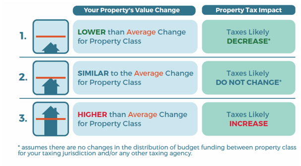 "As noted on your Assessment Notice, how your assessment changes relative to the average change in your community is what may affect your property taxes."
