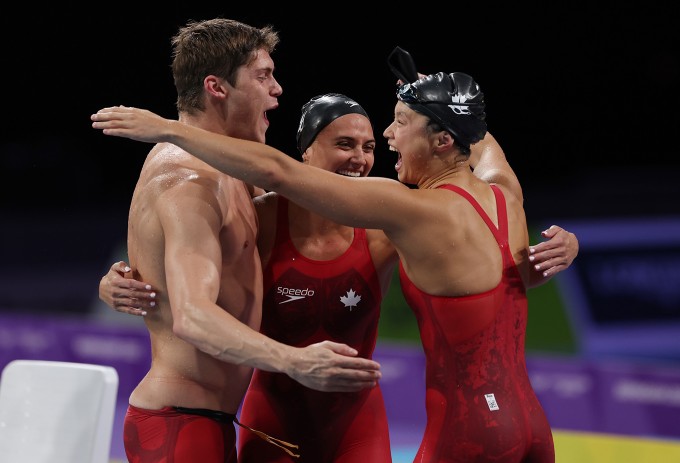 The team of Dergousoff, Kylie Masse, Maggie Mac Neil and Ruslan Gaziev finished with a collective time of 3:43.98 to earn Canada the silver medal.