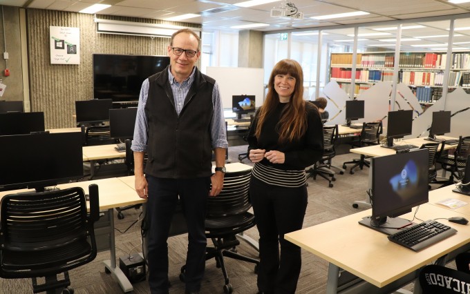 Selkirk College librarians Gregg Currie (left) and Sarah James (right) have been welcoming students to dive deeper into their studies in the new computer lab on the Castlegar Campus. Made possible through funding from Columbia Basin Trust, the lab provides both an important service and an opportunity to teach students the importance of information literacy.