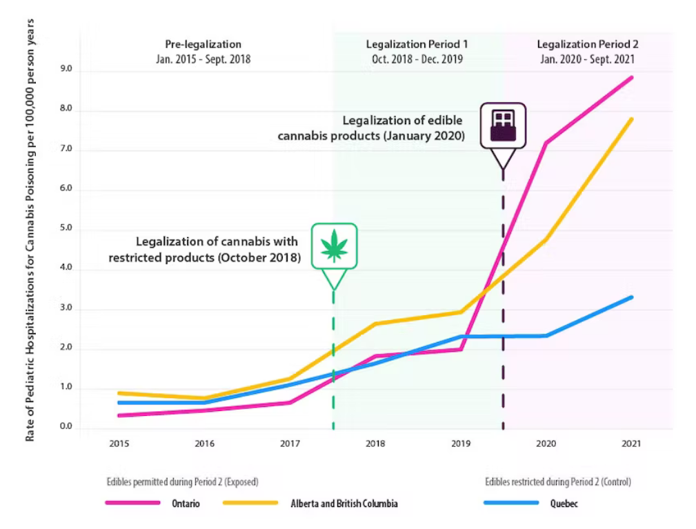 We found that most of the increase in cannabis poisonings in young kids happened after edible products came to market, and that Québec — which prohibited their sale — was protected from this effect and saw a much more modest increase in pediatric cannabis poisonings.