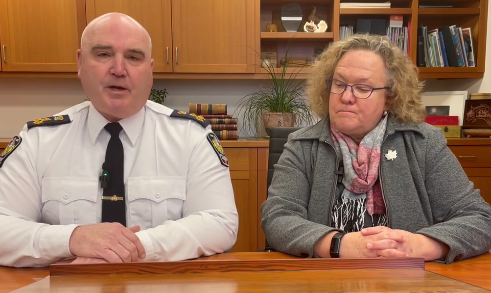 Nelson Police Chief Donovan Fisher and Nelson Mayor Janice Morrison appeared in a video link to announce the sad news of the passing of Const. Mathieu Nolet Saturday morning in Kelowna Hospital. — Screenshot photo