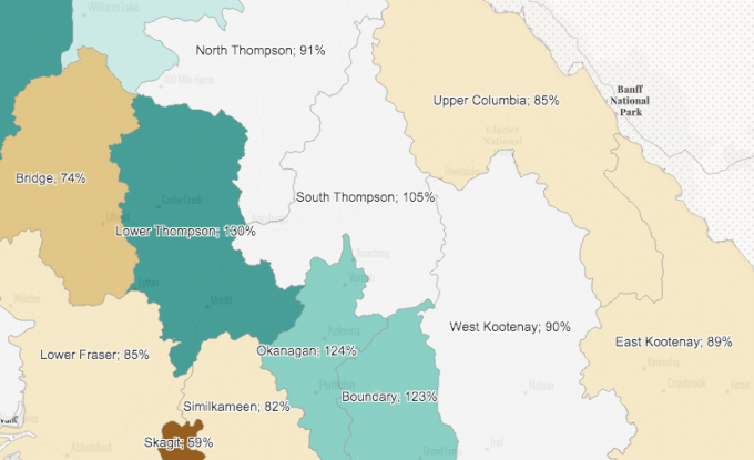February was drier than normal for the region — but rose from only 84 per cent of near normal in January — and the West Kootenay showed an 18 per cent drop in snow pack (versus normal) compared to last year at this time.