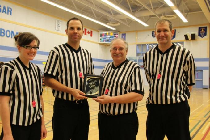 Don Dozzi (second from right) was presented with the Bob Hall Award of Merit award by fellow West Kootenay officials, from left, Nina Flanagan, Franklin Urban and Kevin Flanagan in 2012. The winner of the Bob Hall award demonstrates professionalism, enthusiasm and a willingness to support and adapt to progressive change; offer dedication and support for the BC Basketball Officials Association and its policies and procedures; be well respected within the local basketball community and support basketball officiating both locally and regionally. — Submitted photo