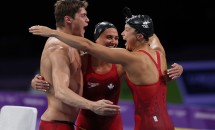 The team of Dergousoff, Kylie Masse, Maggie Mac Neil and Ruslan Gaziev finished with a collective time of 3:43.98...